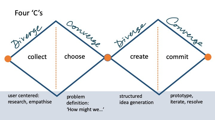 Thinking back to the double diamond process typical for a ‘design thinking’ workshop, we clearly see diverging and converging territories. Divergence is in ‘collecting in ideas and information about a challenge’ and ‘creating ideas for a solution’. Convergence is in ‘choosing which challenge to work on’ and ‘committing to a solution through prototyping or storyboarding’. (Get an overview of design thinking workshops in this post).